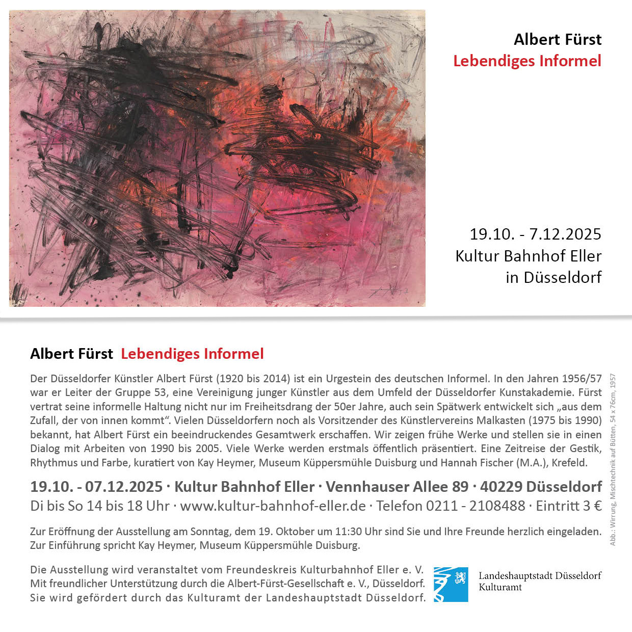 Der Düsseldorfer Künstler Albert Fürst (1920 bis 2014) ist ein Urgestein des deutschen Informel. In den Jahren 1956/57 war er Leiter der Gruppe 53, eine Vereinigung junger Künstler aus dem Umfeld der Düsseldorfer Kunstakademie. Fürst vertrat seine informelle Haltung nicht nur im Freiheitsdrang der 50er Jahre, auch sein Spätwerk entwickelt sich „aus dem Zufall, der von innen kommt“. Vielen Düsseldorfern noch als Vorsitzender des Künstlervereins Malkasten (1975 bis 1990) bekannt, hat Albert Fürst ein beeindruckendes Gesamtwerk erschaffen. Wir zeigen frühe Werke und stellen sie in einen Dialog mit Arbeiten von 1990 bis 2005. Viele Werke werden erstmals öffentlich präsentiert. Eine Zeitreise der Gestik, Rhythmus und Farbe, kuratiert von Kay Heymer, Museum Küppersmühle Duisburg und Hannah Fischer (M.A.), Krefeld.