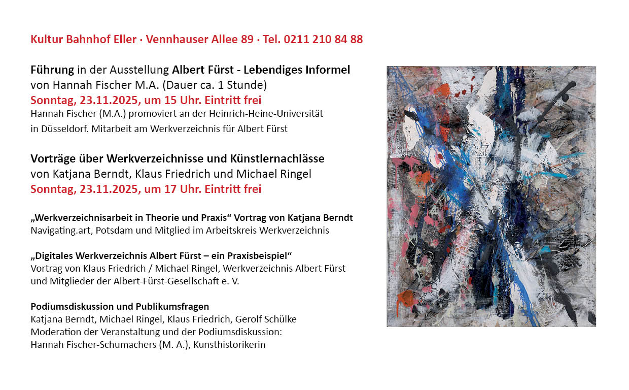 Der Düsseldorfer Künstler Albert Fürst (1920 bis 2014) ist ein Urgestein des deutschen Informel. In den Jahren 1956/57 war er Leiter der Gruppe 53, eine Vereinigung junger Künstler aus dem Umfeld der Düsseldorfer Kunstakademie. Fürst vertrat seine informelle Haltung nicht nur im Freiheitsdrang der 50er Jahre, auch sein Spätwerk entwickelt sich „aus dem Zufall, der von innen kommt“. Vielen Düsseldorfern noch als Vorsitzender des Künstlervereins Malkasten (1975 bis 1990) bekannt, hat Albert Fürst ein beeindruckendes Gesamtwerk erschaffen. Wir zeigen frühe Werke und stellen sie in einen Dialog mit Arbeiten von 1990 bis 2005. Viele Werke werden erstmals öffentlich präsentiert. Eine Zeitreise der Gestik, Rhythmus und Farbe, kuratiert von Kay Heymer, Museum Küppersmühle Duisburg und Hannah Fischer (M.A.), Krefeld.