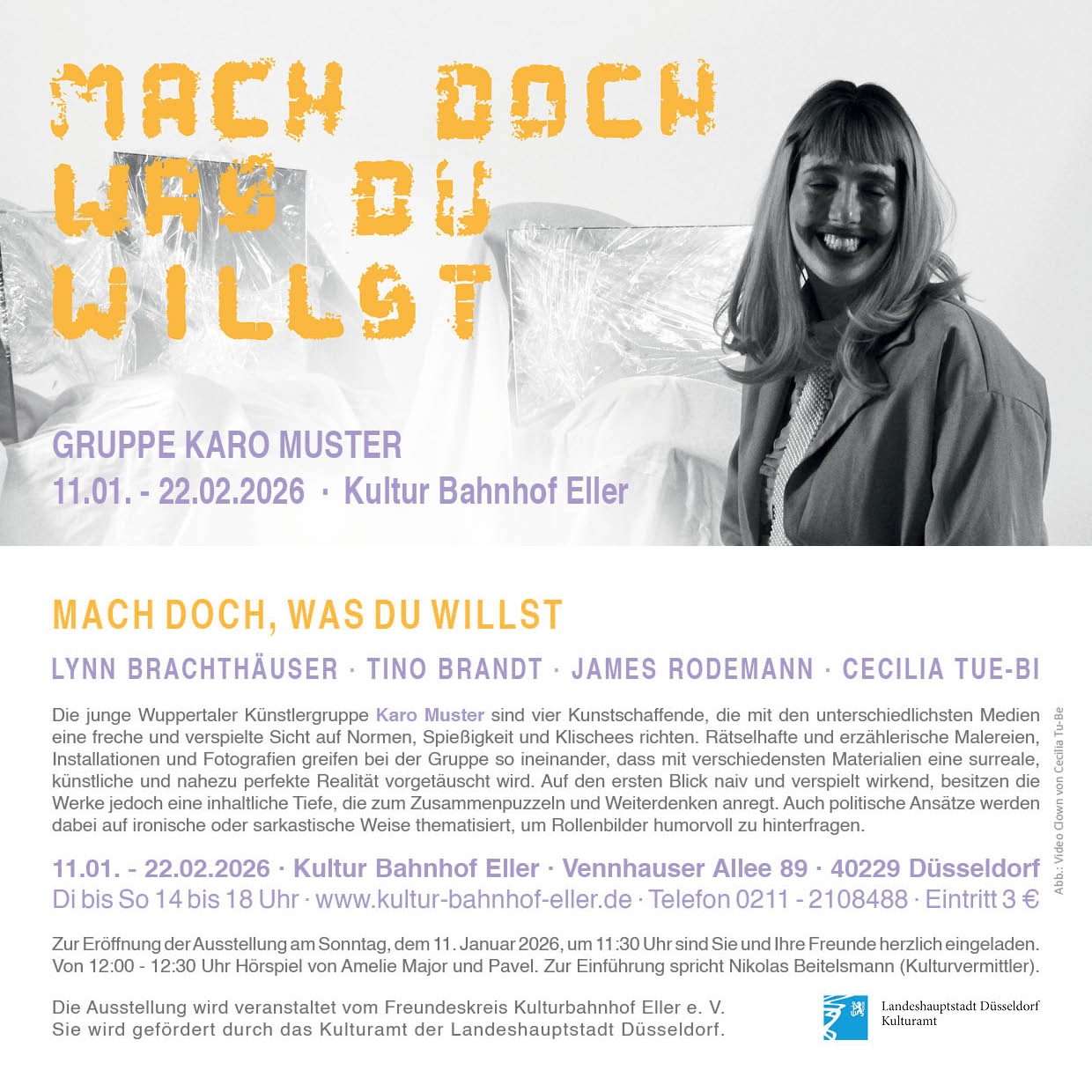 Die junge Wuppertaler Künstlergruppe Karo Muster besteht aus Lynn Brachthäuser, Tino Brandt, James Rodemann und Cecilia Tue-Bi. Vier Kunstschaffende, die mit den unterschiedlichsten Medien eine freche und verspielte Sicht auf Normen, Spießigkeit und Klischees richten. Rätselhafte und erzählerische Malereien, Installationen und Fotografien greifen bei der Gruppe so ineinander, dass mit verschiedensten Materialien eine surreale, künstliche und nahezu perfekte Realität vorgetäuscht wird. Auf den ersten Blick naiv und verspielt wirkend, besitzen die Werke jedoch eine inhaltliche Tiefe, die zum Zusammenpuzzeln und Weiterdenken anregt. Auch politische Ansätze werden dabei auf ironische oder sarkastische Weise thematisiert, um Rollenbilder humorvoll zu hinterfragen.