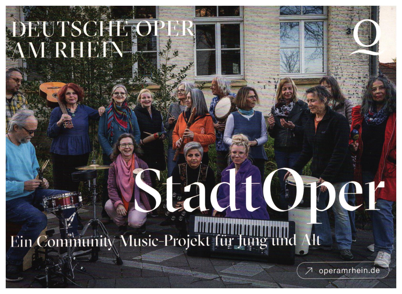 Das Projekt der Deutschen Oper am Rhein bietet unter professioneller Leitung zahlreiche Seminare und Workshops an. Unter der Bezeichnung „StadtOper“ treffen sich jeden Mittwoch Abend Sing- und Spielfreudige im Bürgerhaus Eller. Im großen Wartesaal des Kulturbahnhofs präsentieren sie eine Auswahl aus ihrem Repertoire: Lieder aus Klassik, Folk und Popmusik aus verschiedenen Ländern, meist in Originalsprache, sowie Improvisationen, die zum Mitmachen einladen.